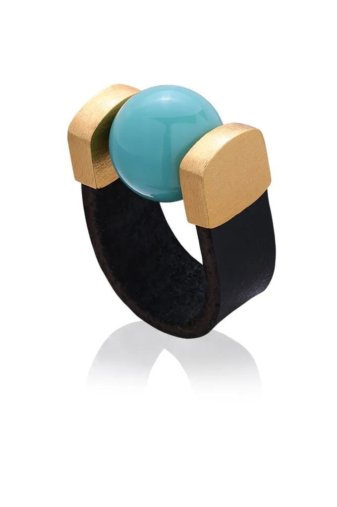 Pierścionek z czarnej skóry naturalnej oraz perły Swarovskiego w odcieniu Jade w rozm. 14 mm. Okucia mosiężne, ręcznie szlifowane, złocone 24 ct złotem. Szerokość paska skórzanego 10 mm.